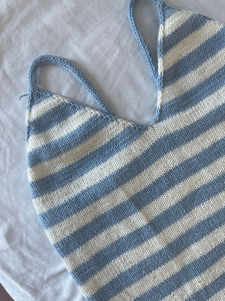 First, stitches are cast on using Judy's Magic Cast-On. Then, half of the cast-on stitches are set aside while you make the triangle of the front piece. You will do this twice so that you have 2 triangles. Then, the triangles are joined to form the front piece, stitches are cast on for the back, and then the rest of the top is worked in the round. The back and the bottom of the top are knitted in garter stitch. Finally, you will make 2 straps with the stitches from the beginning and sew them to the back.